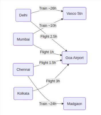 - By Air: Goa has two airports: Dabolim (GOI) near Vasco da Gama and new Mopa (GOX) in North Goa. From Delhi, several carriers (Air India, IndiGo, Vistara) fly ~2.5 hours. For example, Air India lists one-way fares ~₹3,000 (economy) and flight time ~2h30. From Mumbai, direct flights to Goa take ~1h with fares from ₹1,500. Chennai→Goa flights (~1.5h) are ~₹4–6k, Kolkata→Goa (~3h) ₹7–10k (prices as of Feb 2026).